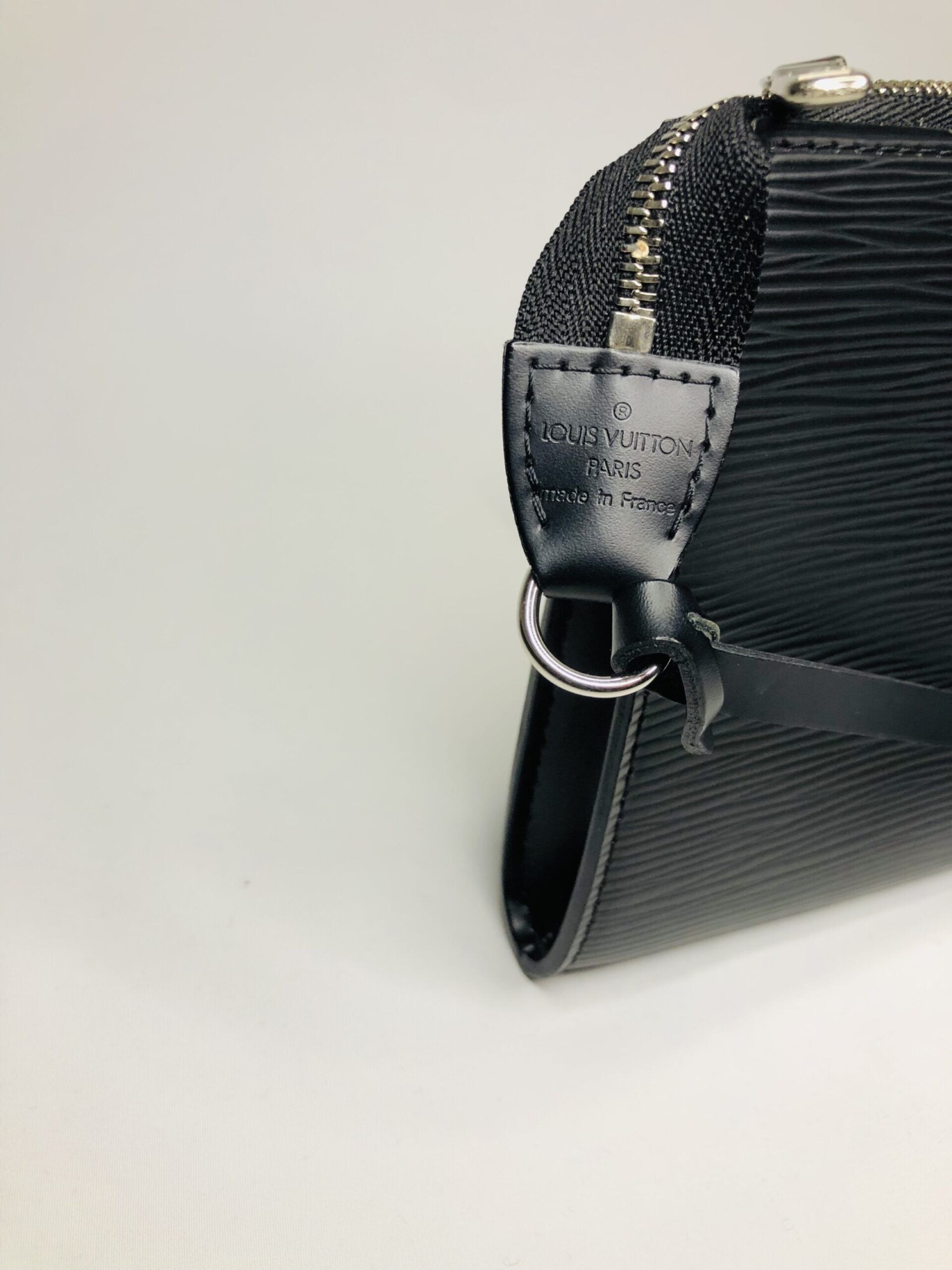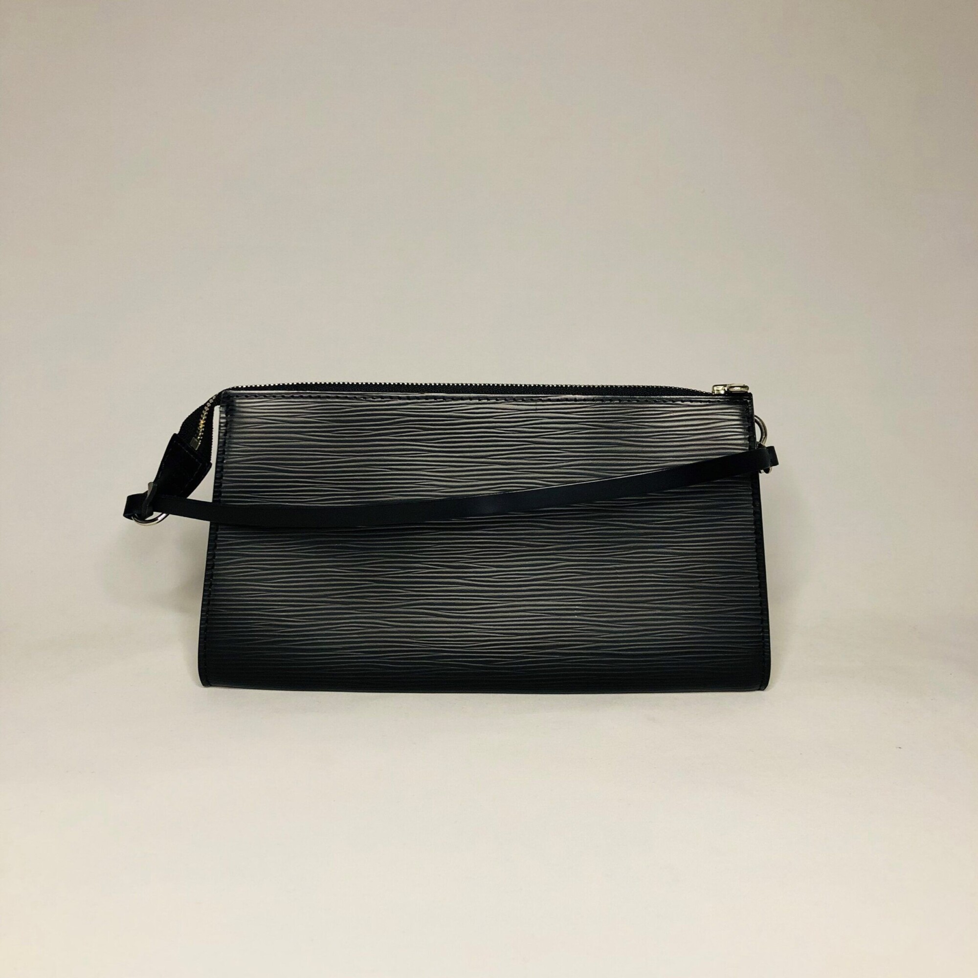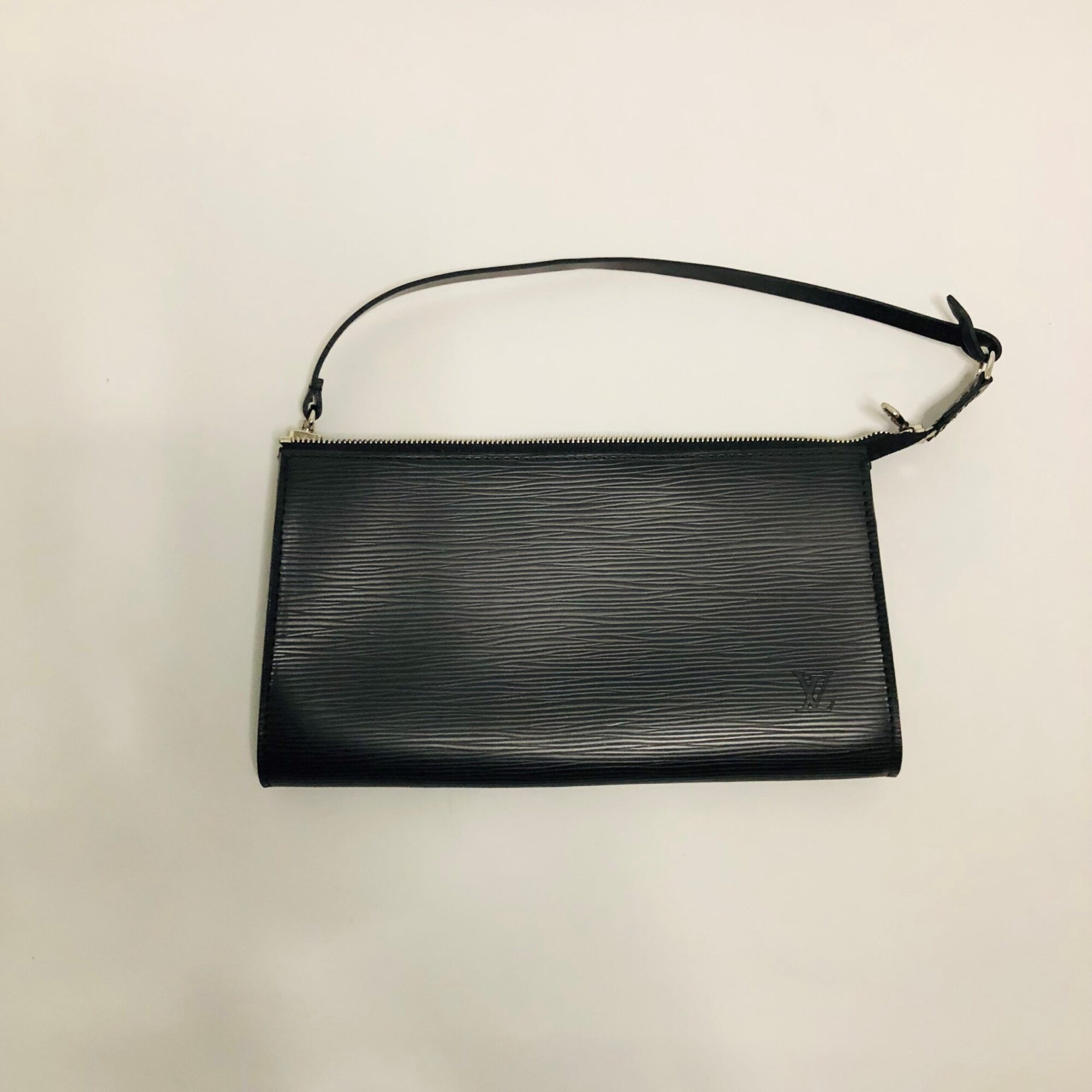 Pochette accessoires NM Louis Vuitton cuir épi noire attributs argentés.